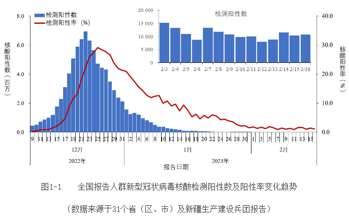 中国疾控中心官网2月18日发布最新的全国新型冠状病毒感染疫情情况,其中显示2022年12月25日以来,各省份报告人群核酸检测阳性率在达峰(29.2%)后开始波动下降,并在2023年2月16日降至1.1%。