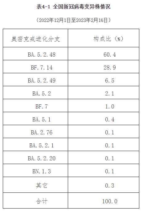 通报称,2022年12月1日至2023年2月16日,全国共报送16931例本土病例新冠病毒基因组有效序列,全部为奥密克戎变异株,共存在34个进化分支。主要流行株为BA.5.2.48(60.4%)和BF.7.14(28.9%)。共发现本土重点关注变异株15例,其中,1例XBB.1,1例XBB.1.5,1例BQ.1,5例BQ.1.1,1例BQ.1.1.17,4例BQ.1.2和2例BQ.1.8。