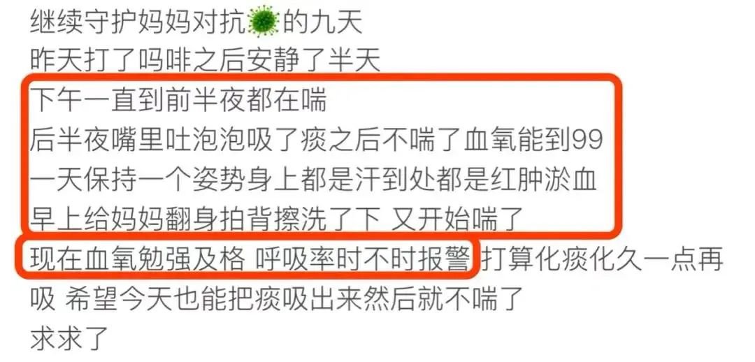 他刚开始记录是自己的妈妈,他妈妈有基础病,但是起初并没有太过在意这个新冠,几天以后就发展成了重症,血氧浓度特别低,痰很多一直喘。
