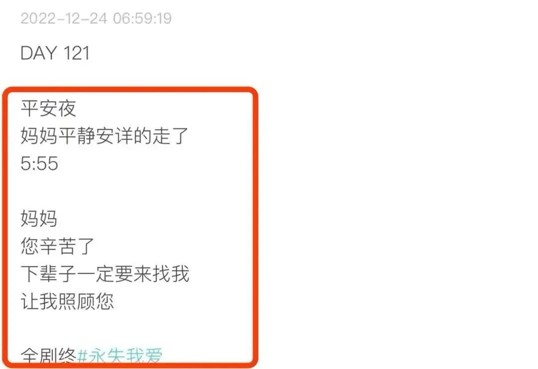 平安夜那天,小伙子的妈妈走了,小伙子说希望有来生,这样就可以在来生照顾妈妈,并且还打上了全剧终。