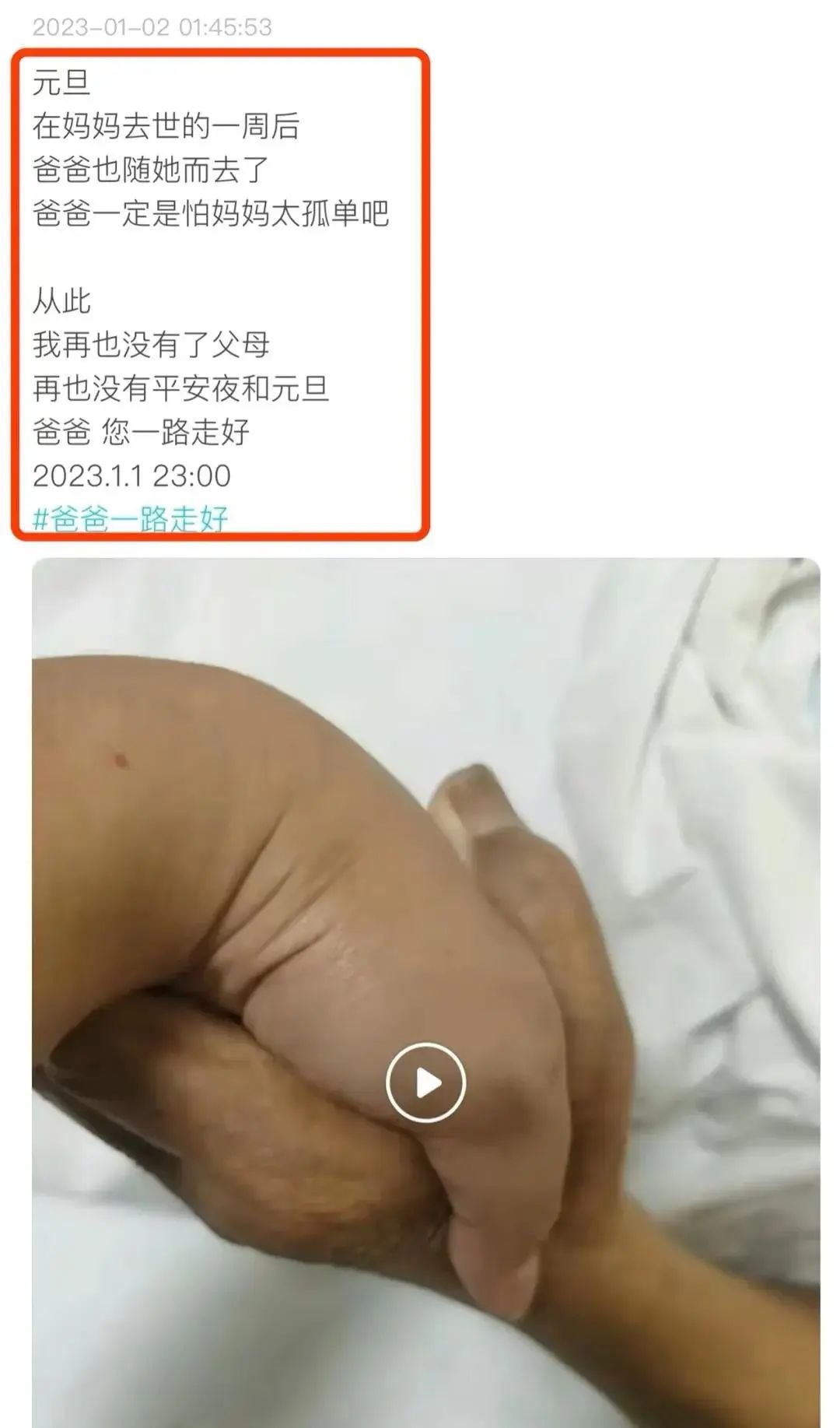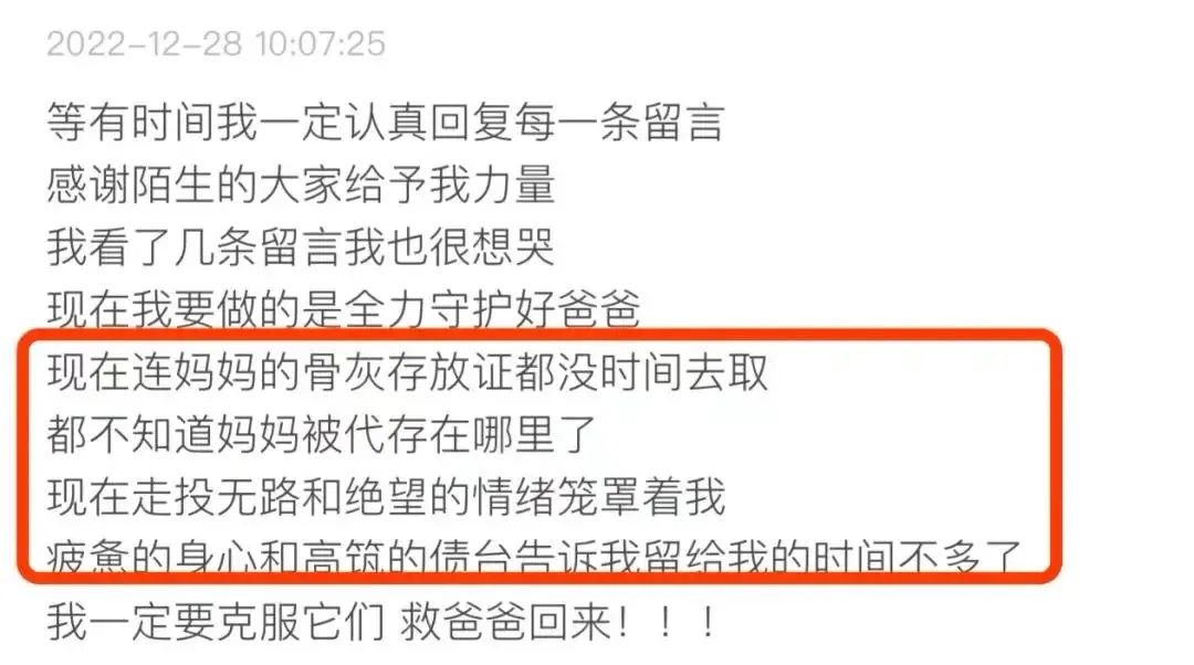 结果,故事还只刚刚开始,母亲刚去世,父亲也重症了,他说他连妈妈的骨灰盒存放证都没有时间取。