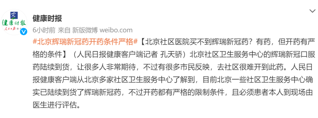 人民日报健康客户端从北京多家社区卫生服务中心了解到,目前北京一些社区卫生服务中心确实已陆续到货了辉瑞新冠药,不过开药都有严格的限制条件,且必须患者本人到现场由医生进行评估。