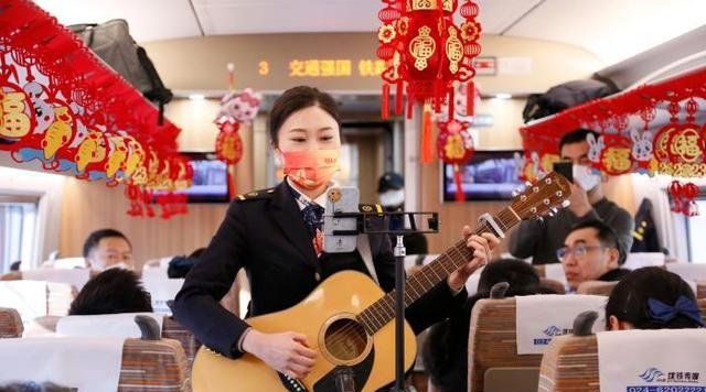 歌曲独唱《我们都是追梦人》拉开了列车联欢的序幕,舞蹈《快乐指南》《灯火里的中国》收到了旅客们的阵阵掌声。吉他独奏《大约在冬季》最受欢迎,随着熟悉的旋律播出,旅客们不由自主地进行了合唱。