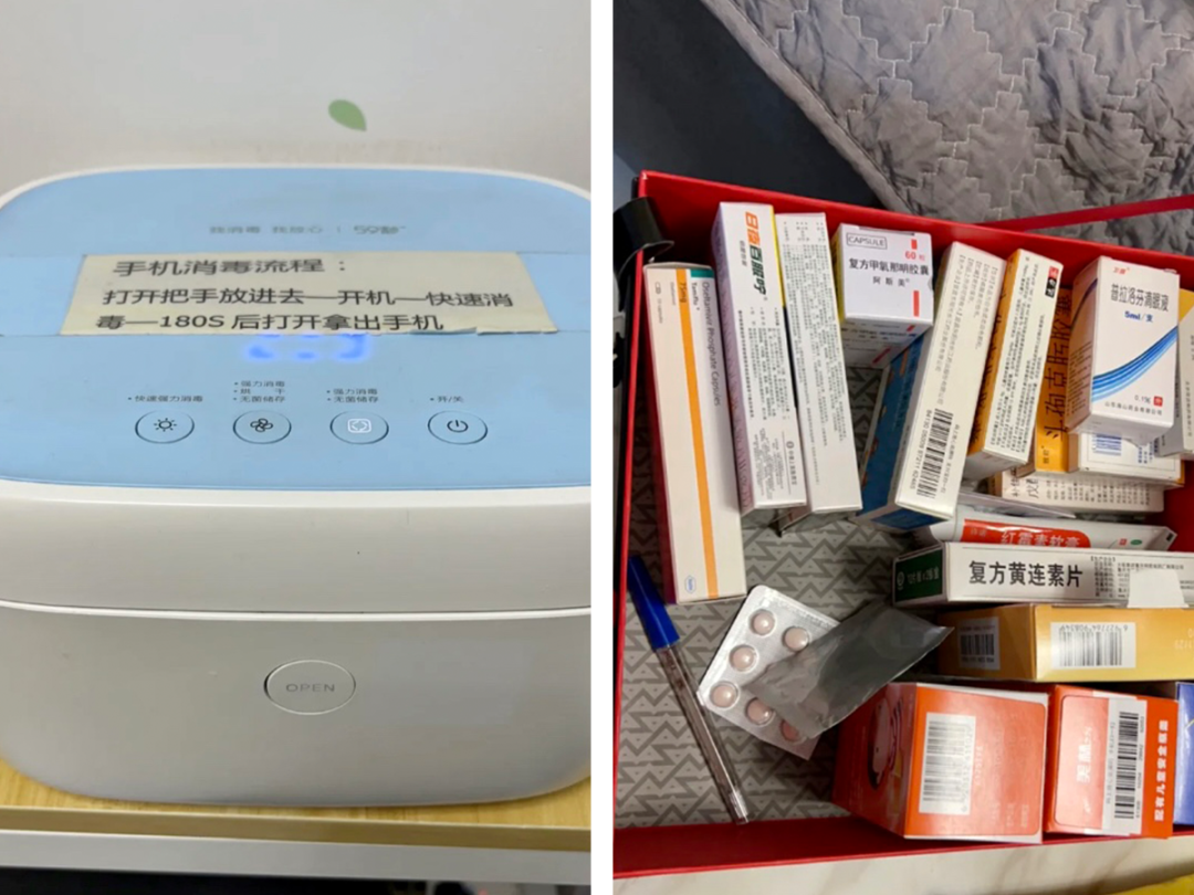 左:医院里的手机消毒箱,小昀每天严格防护自己