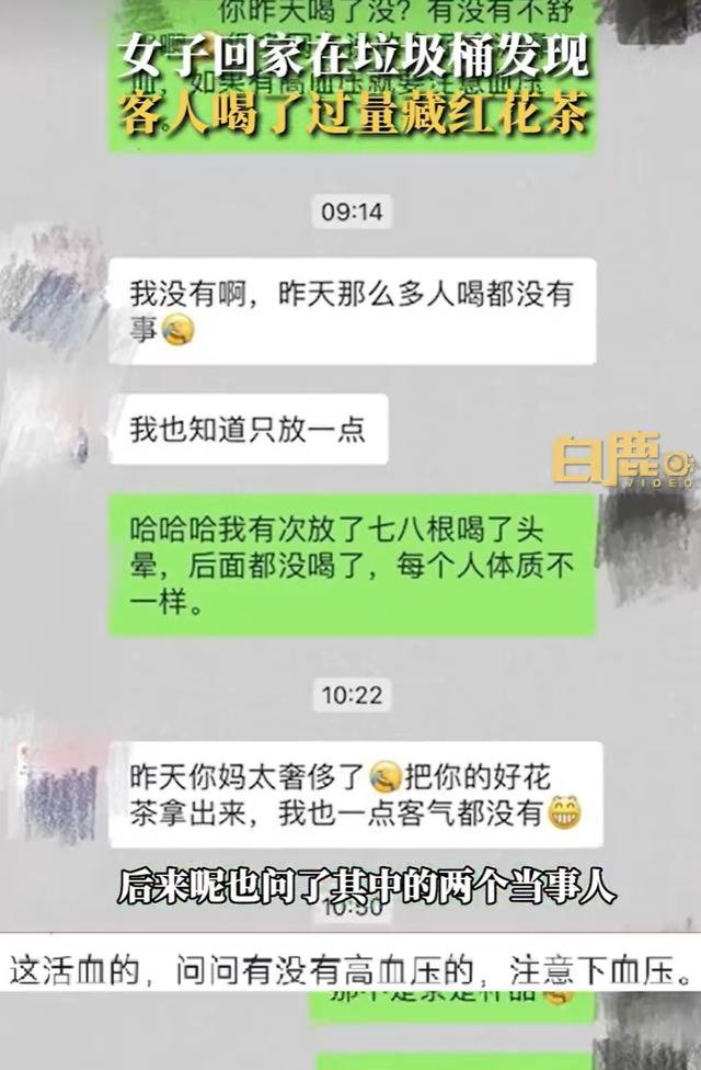 钱女士称,看到垃圾桶里的藏红花后,连忙叫醒了正在睡觉的妈妈。“她说是亲戚看到了,然后自己动手去泡的,也告诉过亲戚只能放几根,但是也不太好劝阻。”