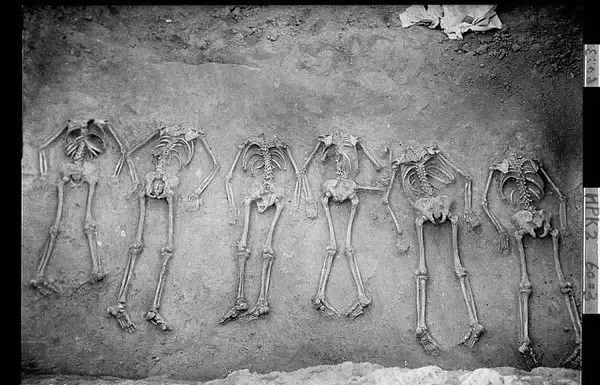 在殷墟一座宫殿旁边,发掘出一百多座杀人祭祀坑,被杀人骨近六百具。这些尸骨大都身、首分离,是砍头之后被乱扔到坑里。两个坑内还埋着十七具惨死的幼童。这座宫殿奠基时也伴随着杀人祭祀:所有的柱子下面都夯筑了一具尸骨;大门则建造在十五个人的遗骨之上,其中三人只有头颅。