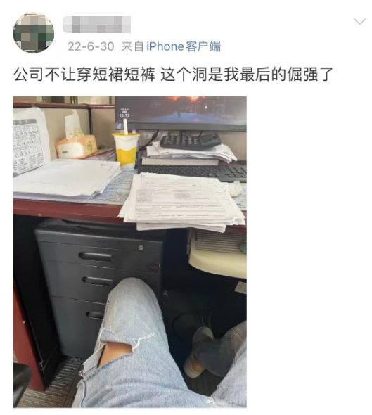 有人被领导提醒大热天的不能穿短裙,就趁其他人不注意,把长裙扎到了膝盖以上。