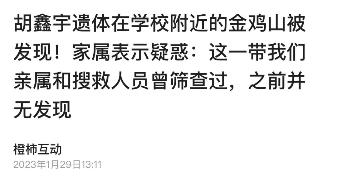稍早前,据媒体报道,胡鑫宇家人委托的律师郑晓静称,1月28日,疑似胡鑫宇的遗体被发现。1月29日上午,经DNA鉴定,遗体确为胡鑫宇。