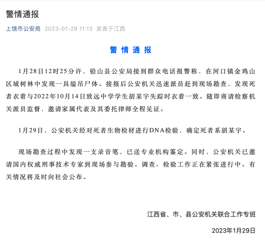 1月29日,江西省、市、县公安机关联合工作专班发布警情通报称,1月28日12时25分许,铅山县公安局接到群众电话报警称,在河口镇金鸡山区域树林中发现一具缢吊尸体。