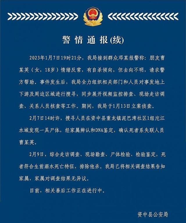 2月9日,据资中公安微信公众号发布警情通报,2023年1月7日19时21分,我局接到群众邓某报警称:朋友曹某英(女,18岁)情绪反常,有自杀倾向,但去向不明,请求警方帮助。事件发生后,我局全力组织相关部门和人员对事发地上下游及周边区域进行搜寻,同步展开视频监控排查、现场走访调查、关系人员核查等工作。期间,我局于1月13日立案侦查。