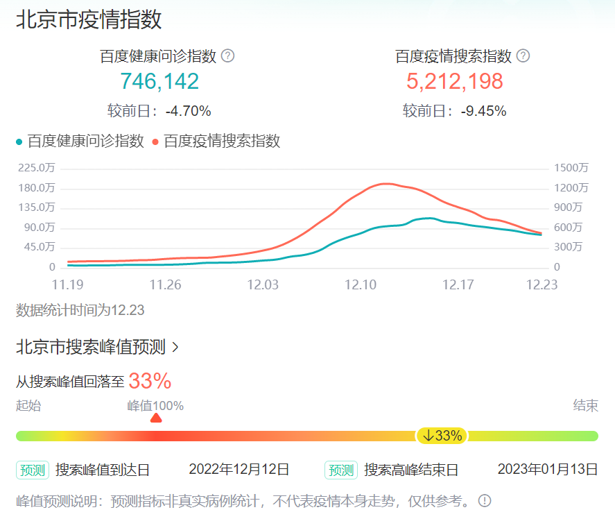 可以佐证的是,疫情搜索指数来看,北京在达到峰值之后一路下滑,如今已回落到33%。根据预测,明年1月13日,搜索高峰有望迎来结束之际。