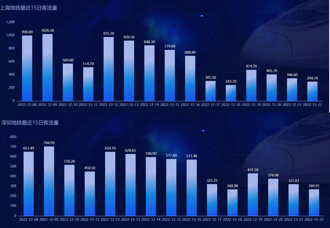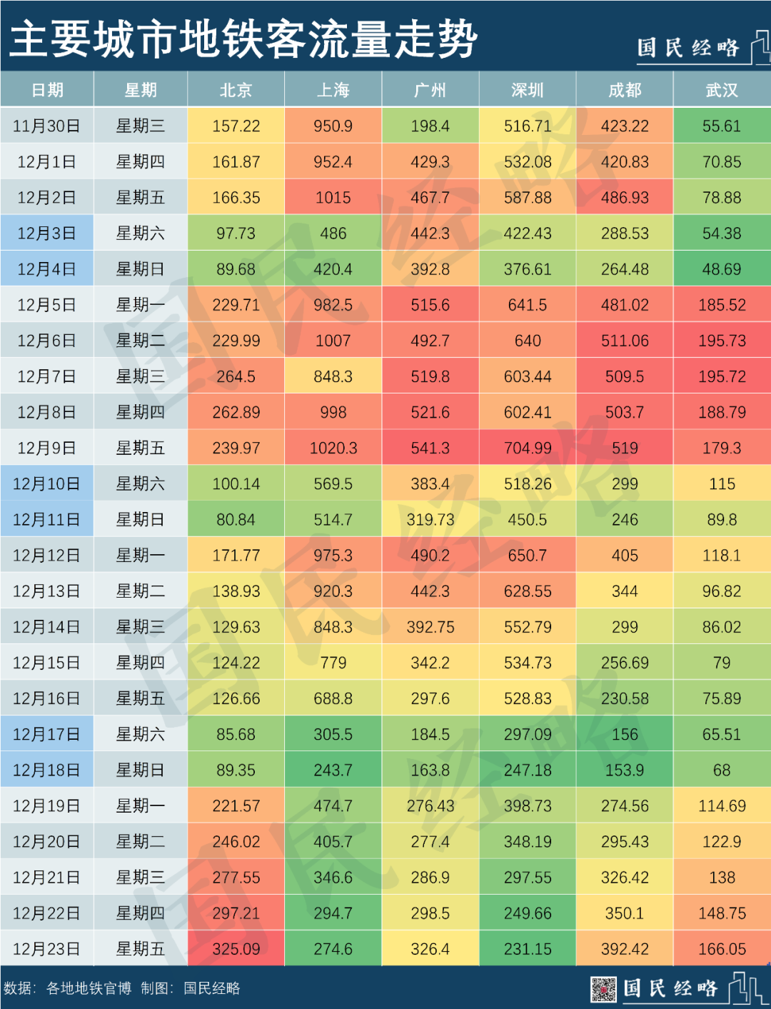 以12月1日为最初解封日期,12月5日各地陆续取消地铁查验核酸限制,地铁管控正式解除,各地客流量随着疫情波动而起伏。