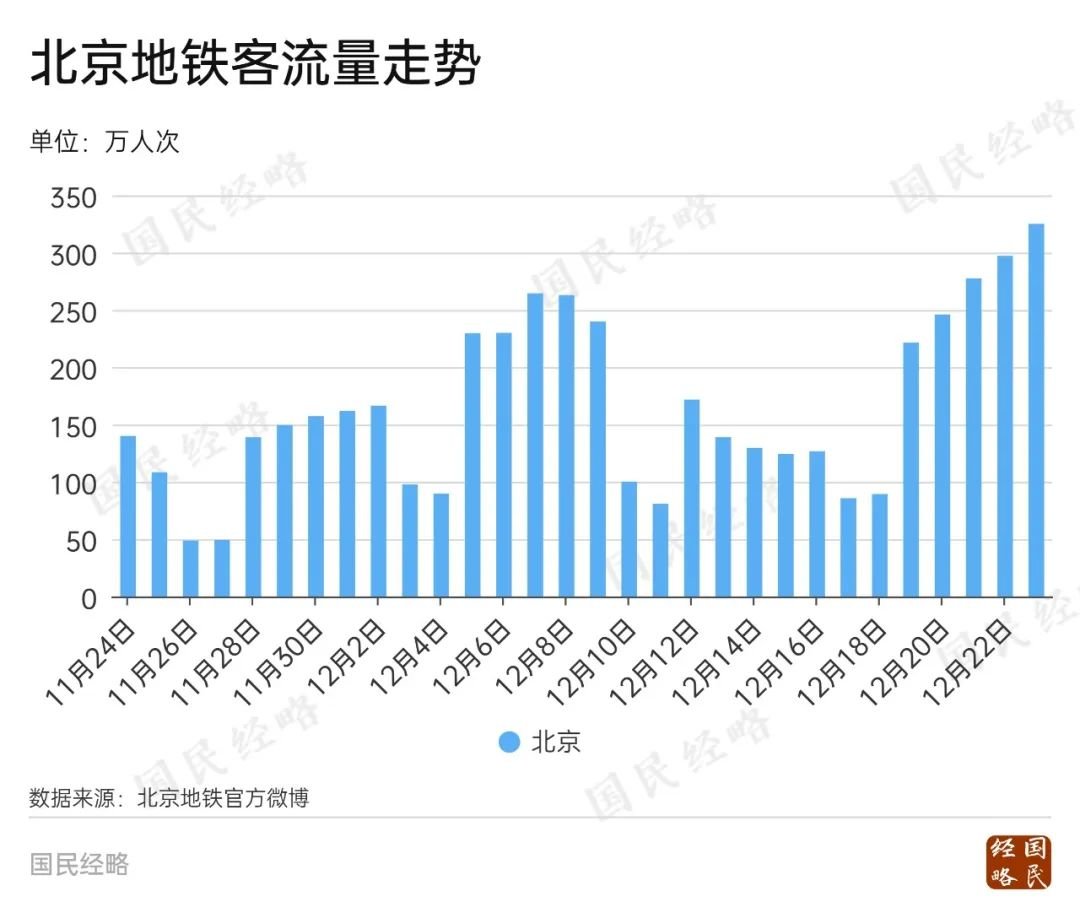 从12月19日以来,北京地铁客流量开始逐步爬坡,陆续迈过200万、300万大关,整个城市开始恢复活力。