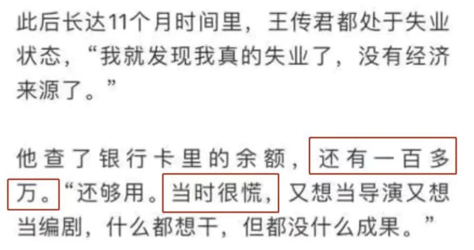 王传君在出演《我不是药神》后接受采访,他直言此前自己失业长达11个月,银行卡余额只剩一百来万,很慌。