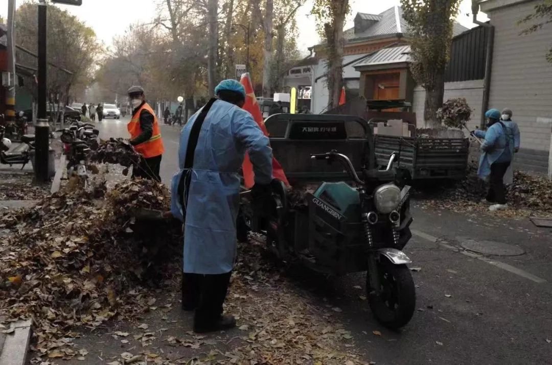 解封后环卫工人在清扫落叶
