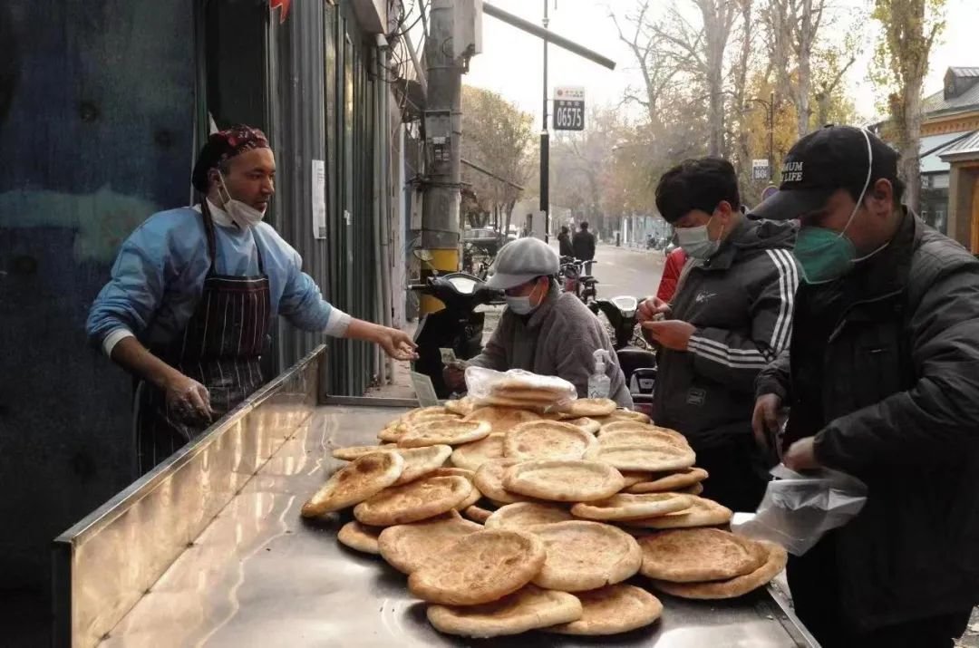 卖馕的阿姨这天生意不错,卖出了200个,虽然比以前还是少了三分之一,但她已经很满足了。旁边的小吃店也是一片热气腾腾,店主把熬得雪白的杂碎汤一碗碗盛出来,吆喝着外卖小哥赶快取走。