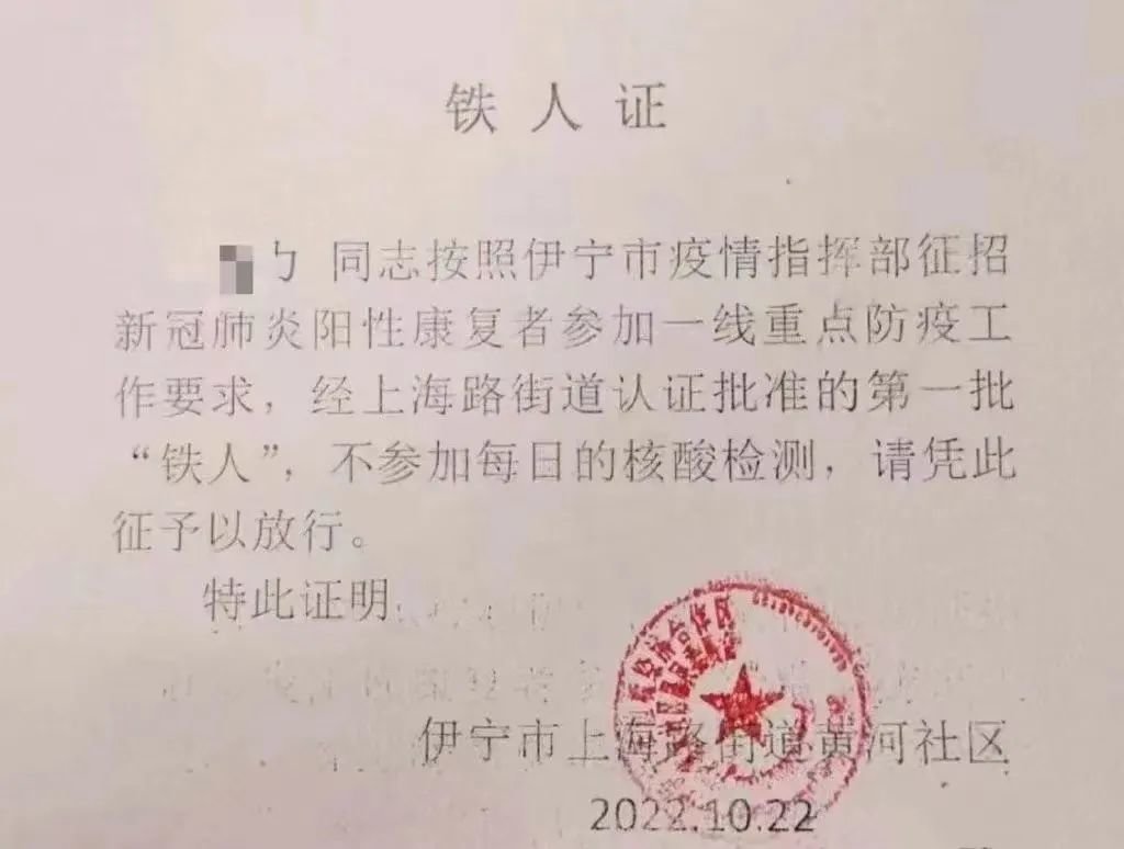 这种民间的叫法被官方提及,是在10月24日伊宁市上海路街道黄河社区发布的一份《关于网传“铁人证”的声明》里,其中称“因我社区工作人员工作不严谨,将核酸检测阳性康复后进行转运保供人员的证明写成了‘铁人证’,引发网民热议”,“对于核酸检测阳性康复人员的不恰当称呼,以及由此引发的不良社会影响,我社区表示深深的歉意。”