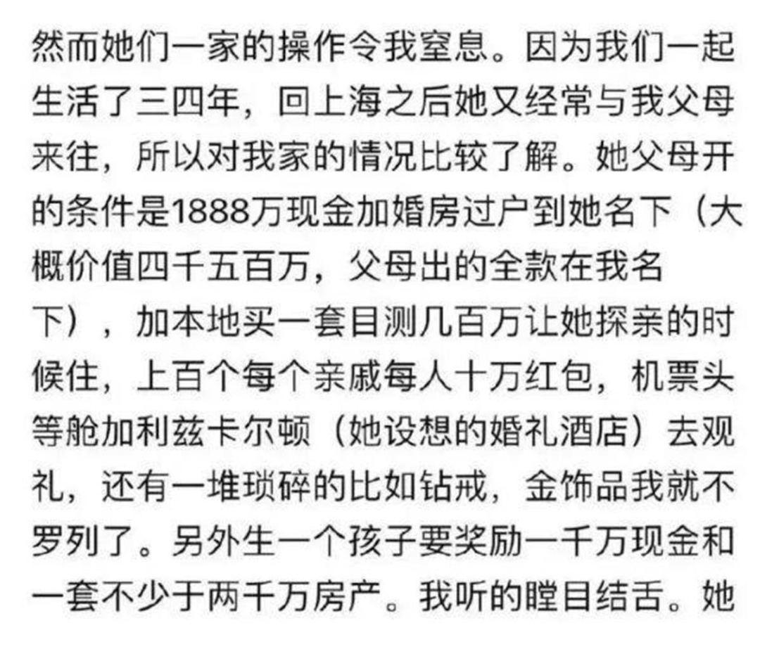 文章简介:策划:涅瓦 编辑:素卡最近,知乎上讨论度最高的帖子,非“1888万+4000万房产”的彩礼莫属。一位自称上海中产的匿名用户,在帖子中向大家讲述了他跟江西萍乡女友的结婚的彩礼故事。目前,网上对这事的定论[db:内容简介]