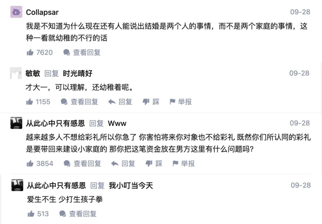 诠释的错位其实都指向了一个问题:我们真的无法单纯地去讨论彩礼这个话题了。彩礼已经成为当代年轻人感情利害的命门,牵一发而动全身。