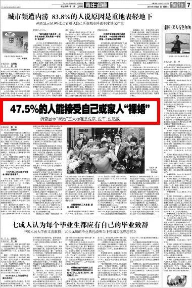 ·《中国青年报》曾刊登对裸婚的调查,样本中有近半数人能接受裸婚
