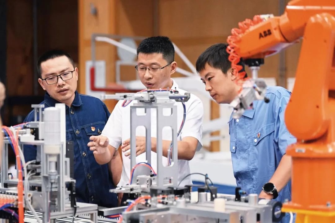 2022 年 8 月 8 日,在天津机电职业技术学院,王兴东(中)、许超(右)和刘世雄在查看首届世界职业院校技能大赛比赛设备 赵子硕摄/本刊