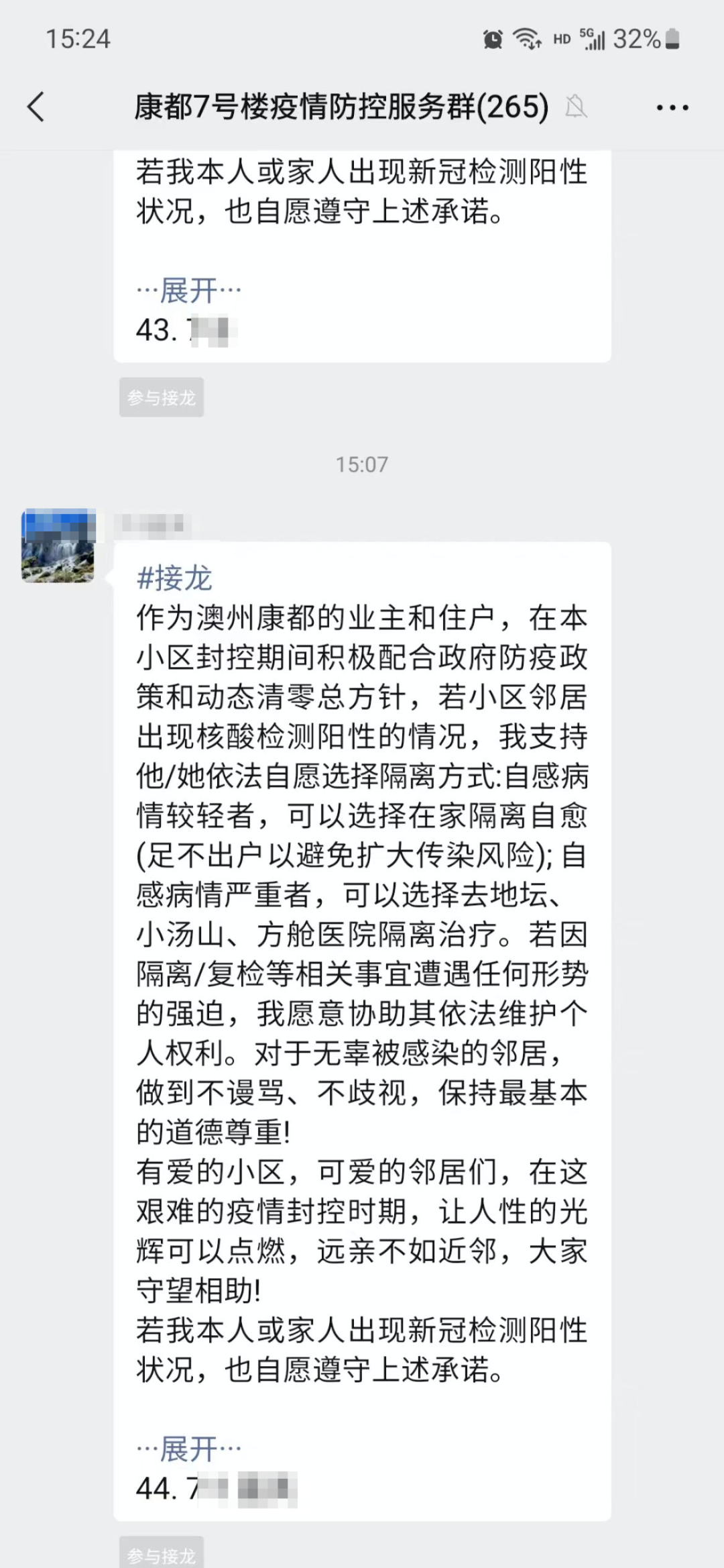 在此期间,邻居们也会不歧视、不指责、不语言暴力,不侮辱谩骂,尊重并为他们加油,随时欢迎他们平安回家。如在隔离期间需要帮助,可以向邻居们求助,力所能及者一定给予最大支持。
