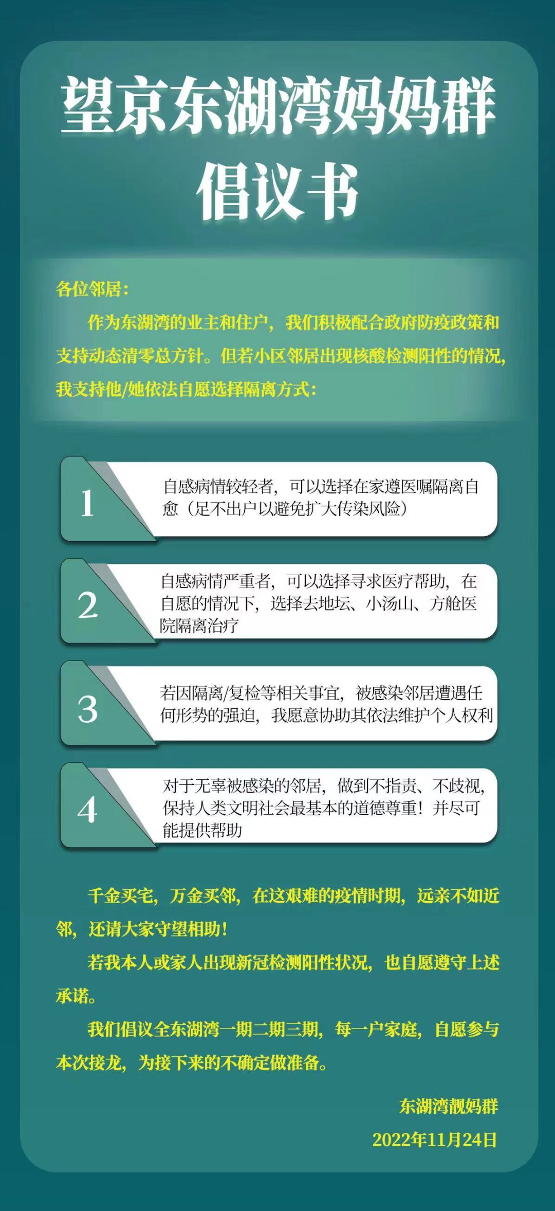 如果测试结果继续复阳,我支持他依法依策自愿选择隔离的方式,自觉症状较轻,或年幼、年长者,本小区居民支持他们可以居家隔离,直至自愈核酸转阴(如有必要,可以对该户安装门磁,保证隔离效果)。