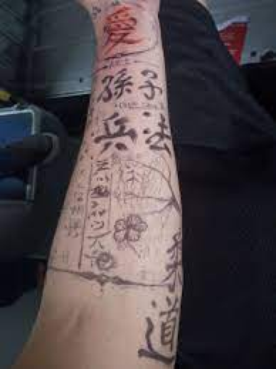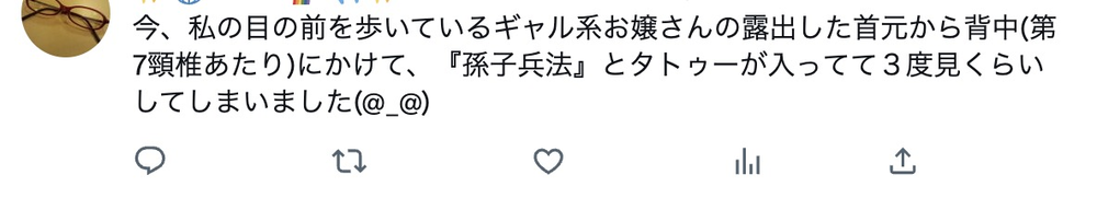 “我前面走着一个辣妹,她裸露的脖子到后背(第七颈椎骨附近)纹得全是《孙子兵法》,害我看一眼,忍不住又看一眼,现在已经是第三眼了@_@”
