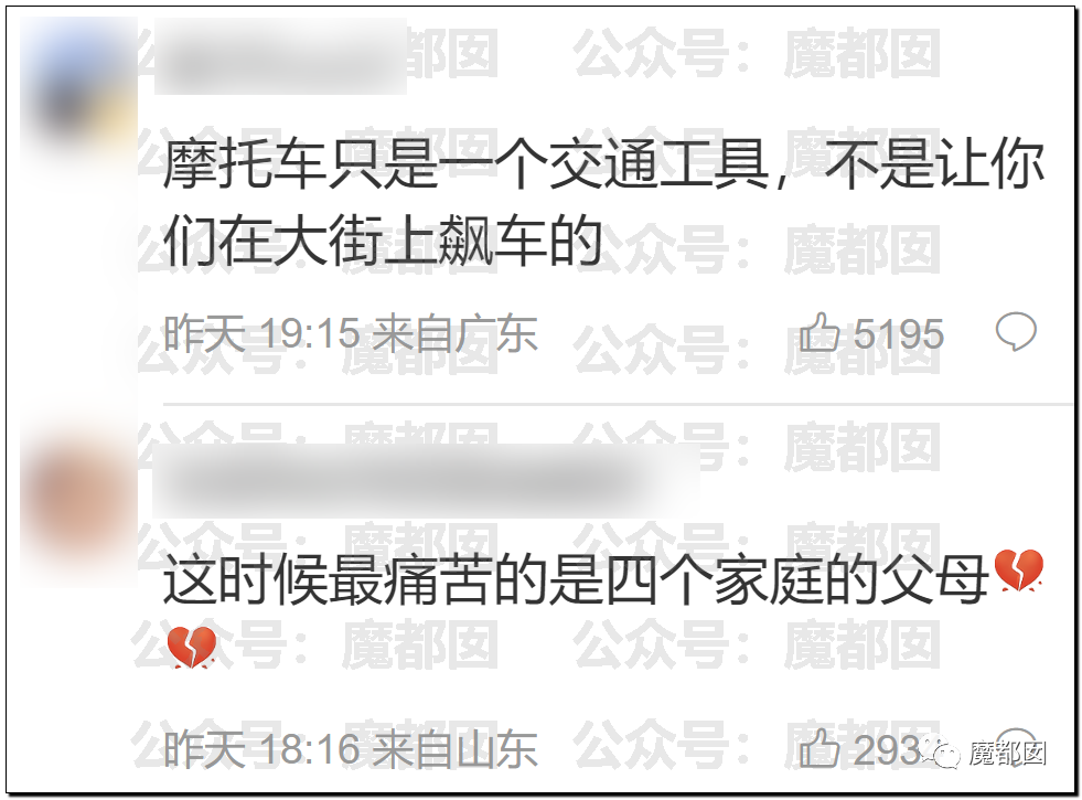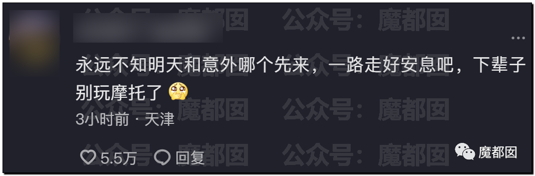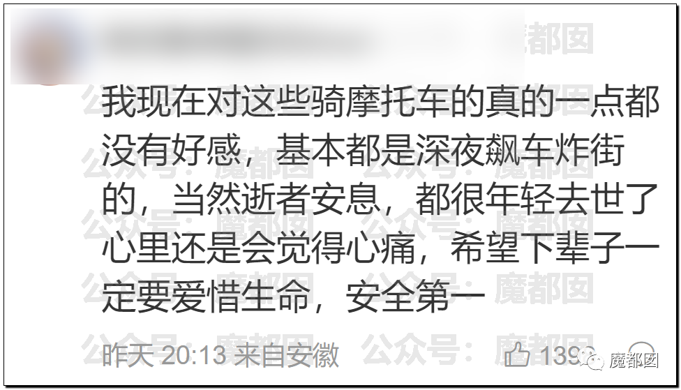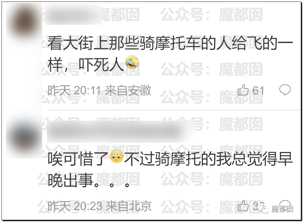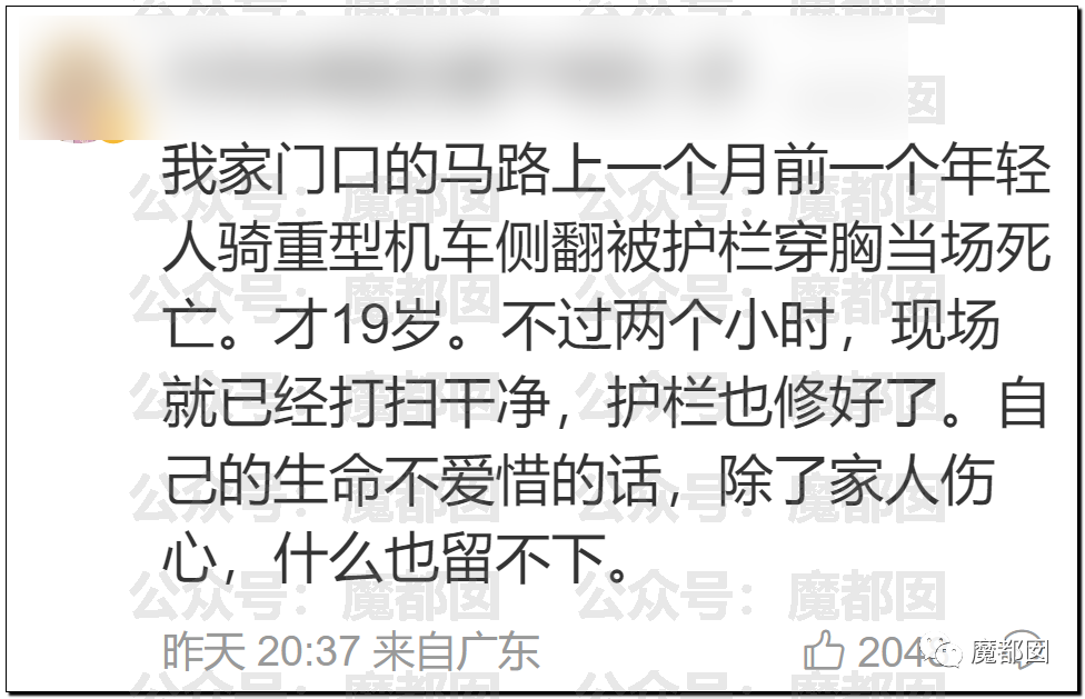 我们也觉得短时间内出了那么多的摩托车事故,是否应该足够引起警惕?很多有实际生活需求的地区和城市老百姓无法拥有属于日常代步的摩托车,而有摩托车的却经常发生这种事情。是法制观念的淡泊?还是仅仅把摩托车当成流量的工具?耍帅的工具?发泄的工具?从历史上看到的几期事故都是逆行或者超速或者不规范行驶乱开,这真的应该引起全社会的警惕。