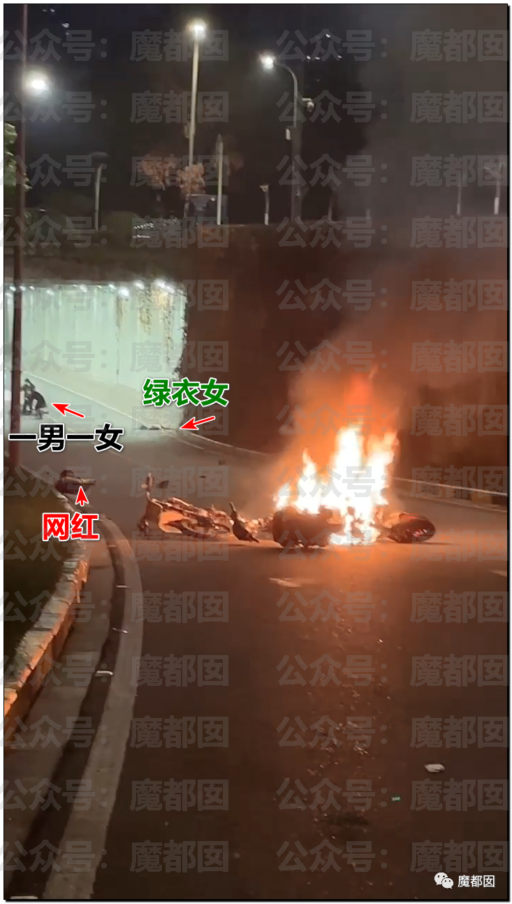 起火的车子旁边躺着一个人,从红衣黑裤来看,很像网红。所以不知道着火的车子是不是就是他的。
