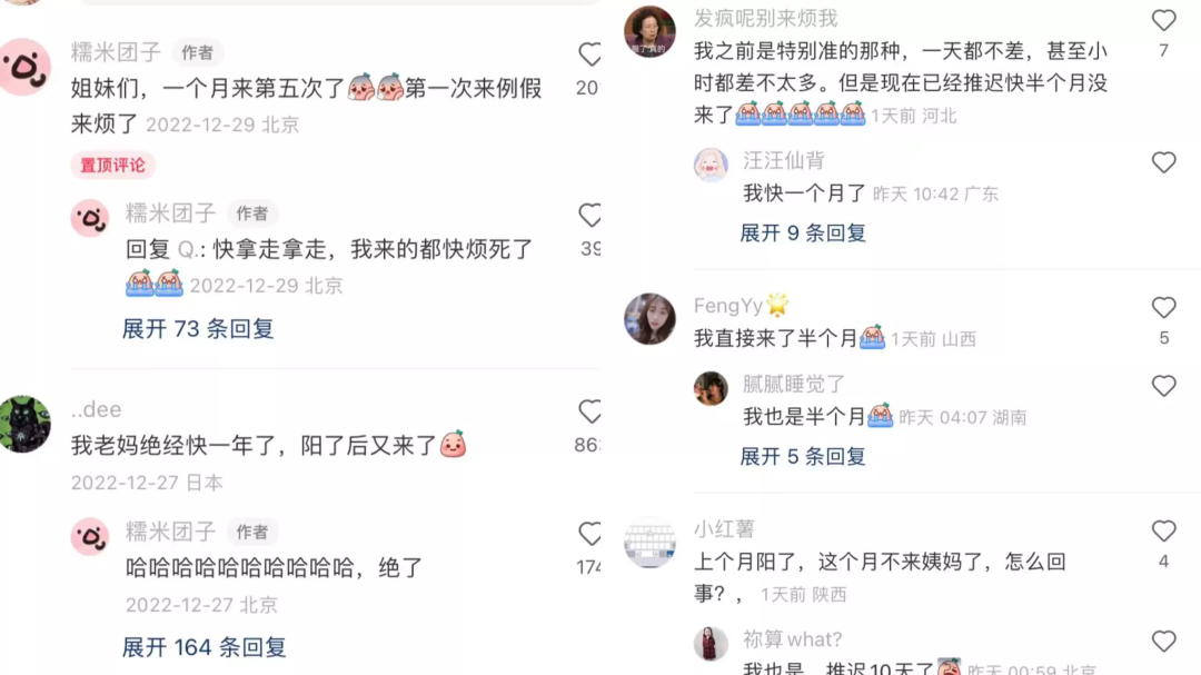 不知道小红书的姨妈符是否灵验,但是阳后不少女生的月经的确出现各种毛病。不仅如此,还有网友表示自己康复后血量前所无比的大,去医院检查甚至需要打止血针,大夫还告诉她,“最近这种情况的女生很多,成因很复杂,什么状况都有,最大原因还是内分泌和免疫力下降的原因”。