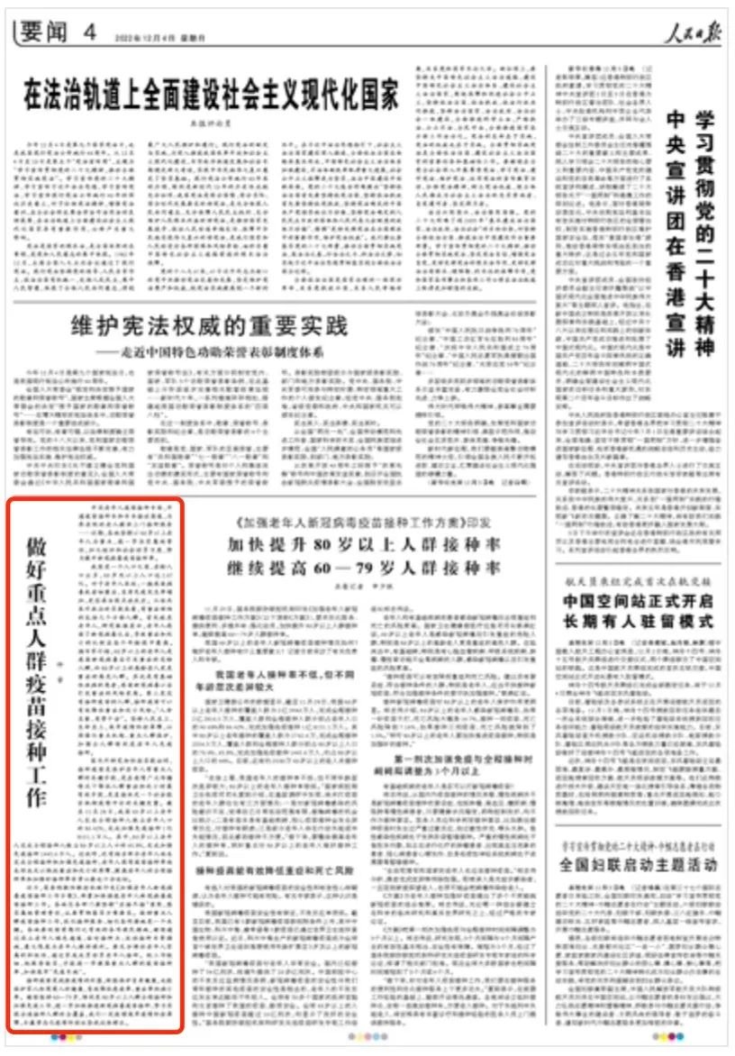 12月4日,《人民日报》刊文《做好重点人群疫苗接种工作》,再谈新冠疫情防控工作。这也是自11月12日以来“仲音”第19次评疫情防控工作。