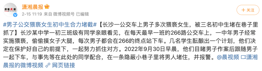 上礼拜一个热搜,三名初中生合力堵截一个公交猥亵男。