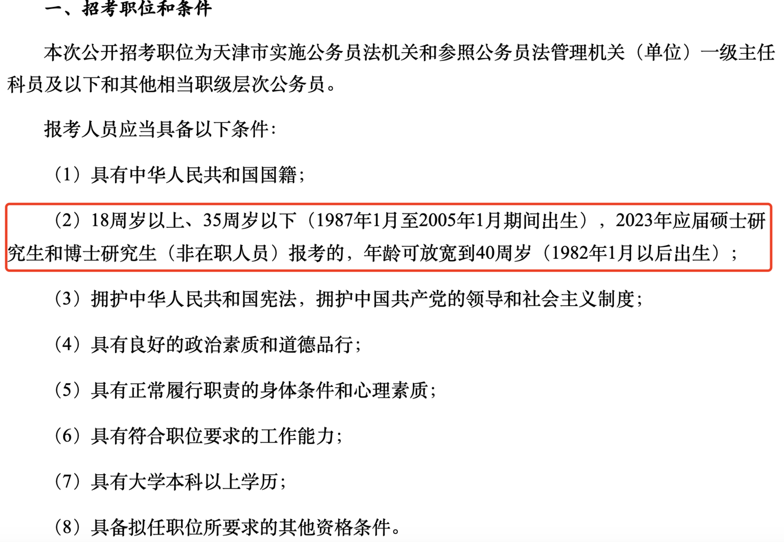 除河南外,天津、内蒙古、广西、重庆等地,也在近些年调整了要求,在公务员招考中指出,2023年应届硕士研究生和博士研究生(非在职人员)报考的,年龄可放宽到40周岁(1982年1月以后出生)。