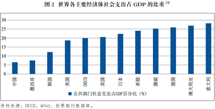 其三,中国政府社会支出占比远低于其他工业大国(如图2所示),社会贫富分化现象比较严重。
