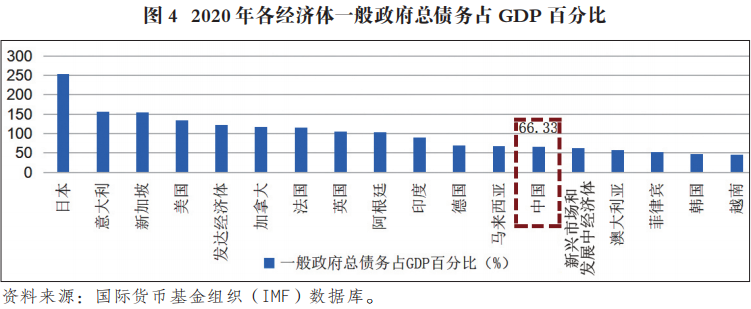 再次,该方案是否会使财政负担太重,债务积累太多,宏观经济风险太大?从动态的观点看问题,未来起点收入不会给财政带来沉重负担。年轻人的边际消费倾向高,发放给他们的起点收入将较大比例地转化为消费支出,市场的繁荣会带来更多投资,进而带动财政收入的增长,这种财政收支的“回旋镖效应”使得赤字的积累速度远低于美欧设想的全民基本收入和美欧实践中的医疗、教育和养老福利制度。未来起点收入也不会使政府债务水平达到难以承受的程度。如图4所示,中国中央政府的债务率非常低,与其他工业化国家相比,还有很大的增长空间。更重要的是,国债风险的高低,关键不在于债务率的高低或者上升速度的快慢,而在于债务定价货币的发行权在谁手上。中国发行以本币计价的国债,不仅是可持续的,而且是非常必要的。