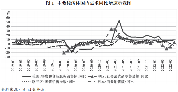 其一,以经济外循环为主的发展模式亟待转型。美欧日三大市场近十亿人口的消费需求对中国制造业的崛起发挥了重要作用,但时至今日,无论是从相对体量还是从国际政治环境来看,这种为西方国家五亿多中产阶级而生产的发展模式已经不可持续。事实上,中国政府已经意识到这一问题,提出要构建以国内大循环为主体、国内国际双循环相互促进的新发展格局。然而,当前中国国内消费的发展态势并不尽如人意。2021年以来,本土消费市场规模增速持续落后于美国(如图1所示),为中国居民提供更多可支配收入以提振内需是必要且紧迫的。
