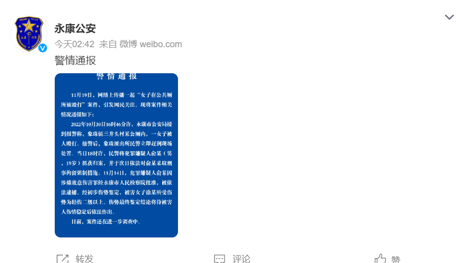 一女子在公厕被人殴打,浙江永康警方通报:犯罪嫌疑人已被依法逮捕