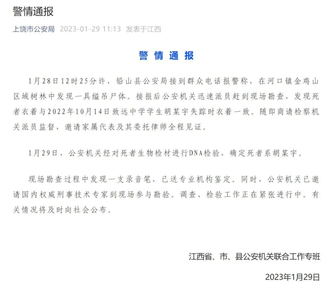 根据@上饶市公安局 发布的《警情通报》,胡鑫宇的遗体在河口镇金鸡山的树林中被找到,发现时处于缢吊状态,现场勘查过程中还发现了一支录音笔。