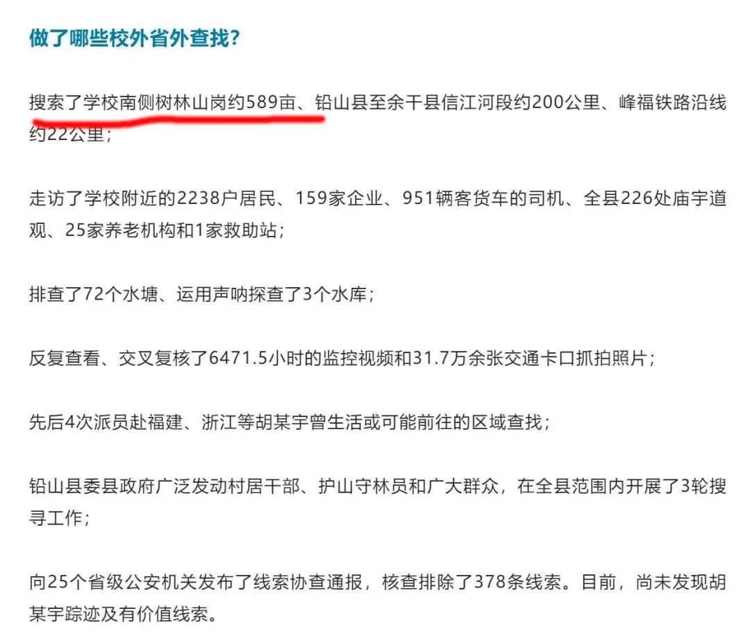 要知道在1月初的相关报道中,当地公安就已联合社会力量(铅山县蓝天救援队、铅山绿舟救援队等)排查了学校南侧树林山岗约589亩,以及其他的很多地方。