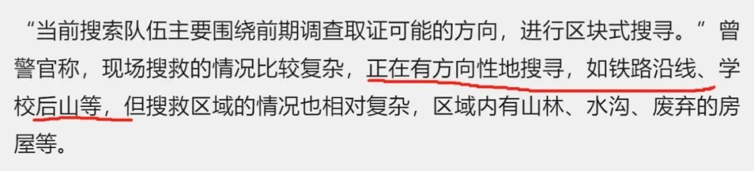 之后公安又不断扩大搜索范围,还启动了上千人规模的搜查,并且还是有方向性地进行“区块式搜查”,专门搜寻了学校后山等重点区域。