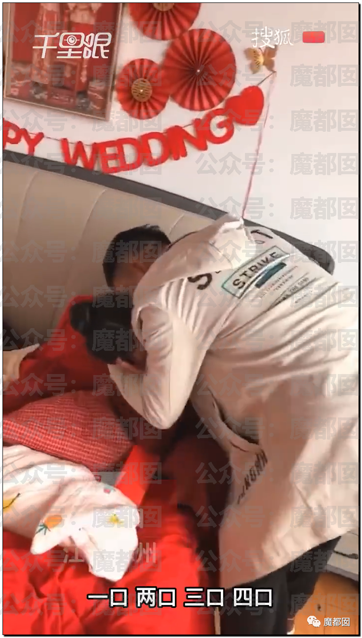 一个男性,一把抱着新娘,开始猛亲,拍摄者还在鼓励“多吃两口”。