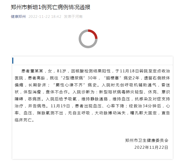 患者董某某,女,81岁,因核酸检测结果阳性,于11月18日转院至定点收治医院,患者高龄,既往“2型糖尿病”30年,“脑梗塞”病史2年,遗留右侧肢体偏瘫,长期卧床;“窦性心律不齐”病史。入院时无创呼吸机辅助通气,昏迷状,体型消瘦,查体不合作。入院诊断为:新型冠状病毒肺炎轻型、休克、意识障碍,恶病质。入院后给予吸氧,维持静脉通路,维持血压,抗感染及对症支持治疗,并告病危。11月19日,患者出现血压、心率下降;经救治34分钟后,心率、血压、指脉氧测不出,无自主呼吸,大动脉搏动消失,瞳孔散大固定,宣告临床死亡。