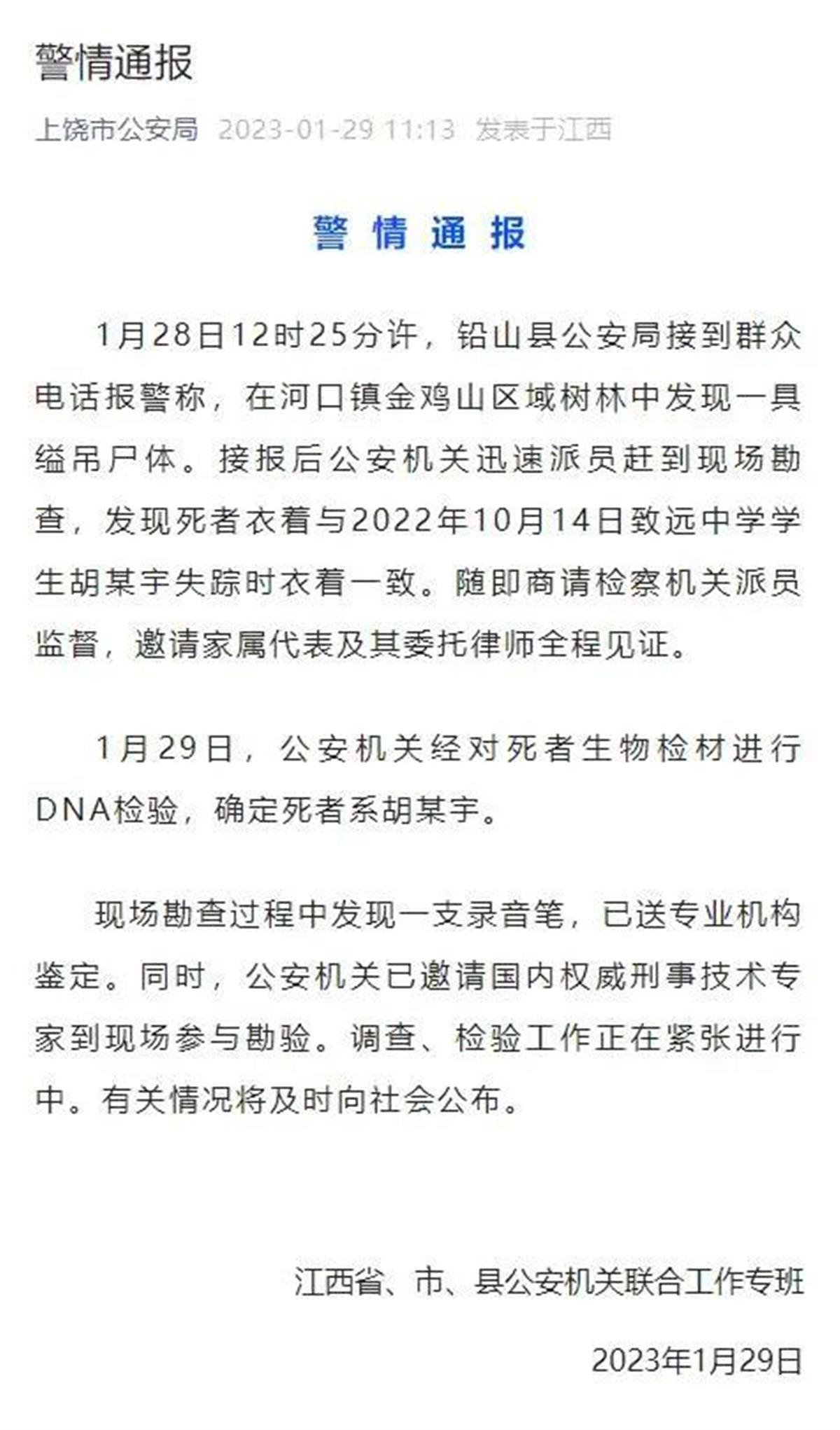 江西上饶市公安局也就胡鑫宇一案发布了通报,称1月28日12时25分许,铅山县公安局接到群众电话报警称,在河口镇金鸡山区域树林中发现一具缢吊尸体。接报后公安机关迅速派员赶到现场勘查,发现死者衣着与2022年10月14日致远中学学生胡某宇失踪时衣着一致。随即商请检察机关派员监督,邀请家属代表及其委托律师全程见证。1月29日,公安机关经对死者生物检材进行DNA检验,确定死者系胡某宇。现场勘查过程中发现一支录音笔,已送专业机构鉴定。同时,公安机关已邀请国内权威刑事技术专家到现场参与勘验。调查、检验工作正在紧张进行中。有关情况将及时向社会公布。