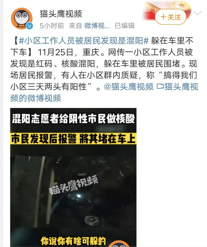 11月25日,网传一段重庆市疫情防控志愿者被堵在车上的视频引发关注。网传视频中称,一名红码志愿者给市民做核酸,被发现后被小区居民堵在车里。