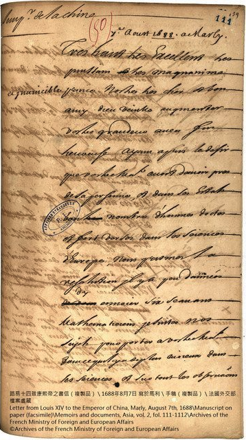 路易十四写给康熙的信(复制品),现存于法国外交部档案处