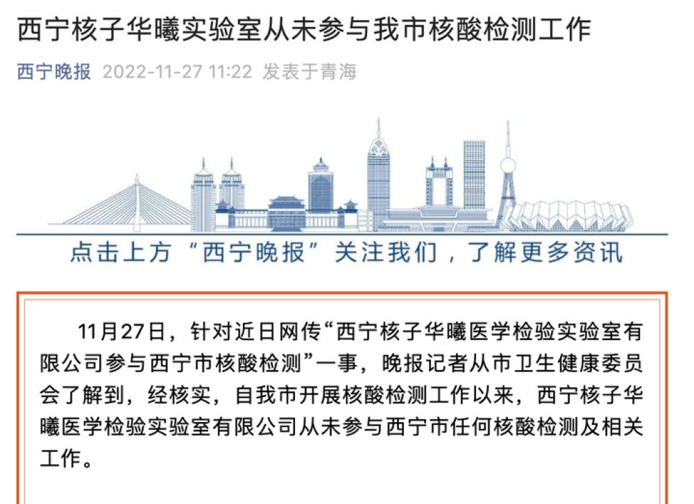 11月27日,针对近日网传“西宁核子华曦医学检验实验室有限公司参与西宁市核酸检测”一事,西宁晚报记者从西宁市卫生健康委员会了解到,经核实,自我市开展核酸检测工作以来,西宁核子华曦医学检验实验室有限公司从未参与西宁市任何核酸检测及相关工作。