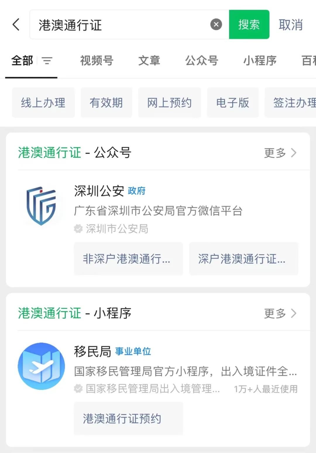 除此之外,微信搜一搜“港澳通行证”,即可一键进入你所在地的官方小程序,办理业务预约、查询等业务。