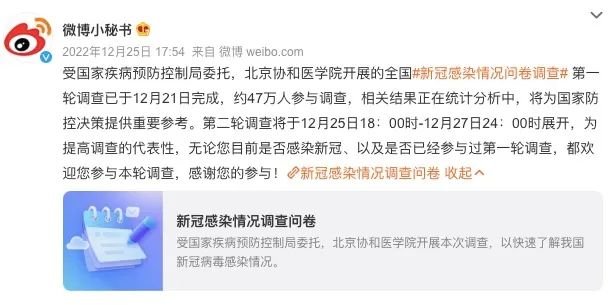 在近期疫情的流行下,网上出现了不少来自官方的调查问卷。12 月中下旬,北京协和医学院的一份「新冠感染情况问卷调查」在网络上流传,该调研「受国家疾病预防控制局委托」。据介绍,目前该调研的第一轮已于 12 月 21 日结束,约 47 万人参与了调查,结果目前尚在分析中;第二轮调查于 12 月 25 日至 12 月 27 日展开。
