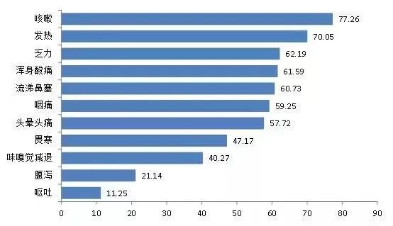 四川省公布的调查结果显示,有 77.26% 的人出现了咳嗽的症状,70.05% 的人 出现了发热的症状;过半数的人存在乏力、浑身酸痛、流涕鼻塞等症状。38.62% 的患者病程超过 5 天。